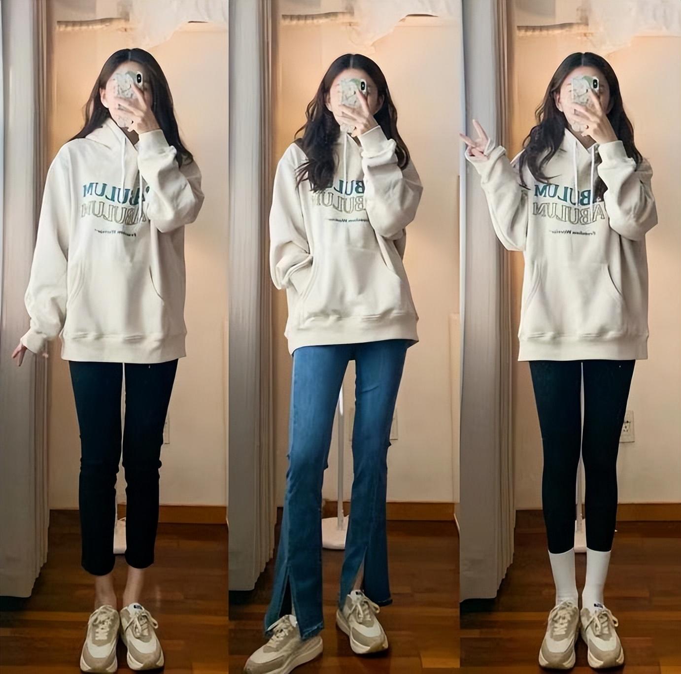 浅灰色的卫衣,作为经典色的其中之一,百搭性是不用质疑的,而且这个颜色也极其不挑肤色穿,所以,即便你是黄皮肤的女性们,也是可以hold住的,当然,也可以穿得很好看!在搭配上,内搭再叠穿一件白色t恤,稍微将t恤的下摆露出来一点,营造出层次感,选择牛仔宽松长裤和运动鞋来配,简单舒适的范就打造了。