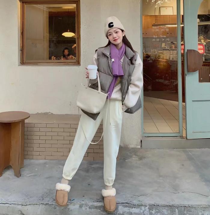 下身配的是一条奶白色束脚运动裤,一双毛毛拖鞋,真正做到了保暖时髦两不误!脖子上系着的紫色围巾,倒成为了整个穿搭的亮点。