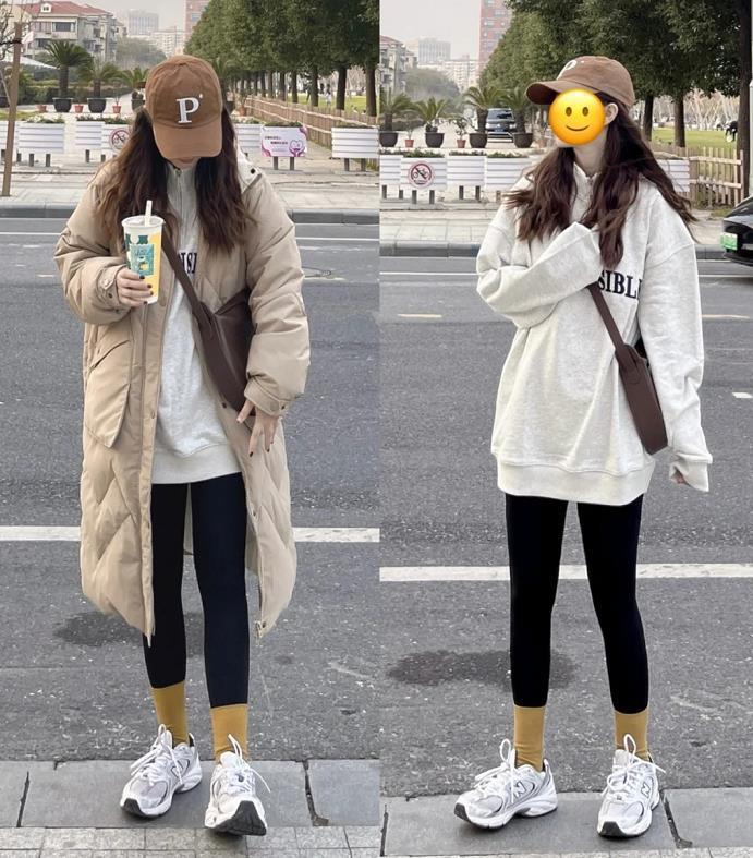 穿法3、长款羽绒服+卫衣+黑色打底裤