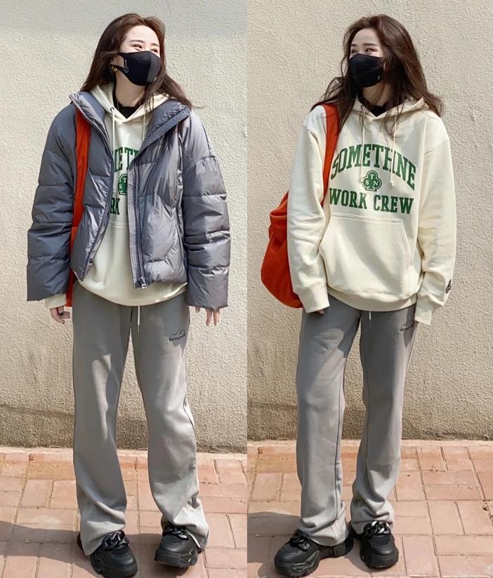 羽绒服的款式虽然是看起来有些蓬松的,但是穿起来一点都不会显胖!内搭浅色连帽卫衣,下身配的是一条浅灰色拖地裤,加上一双黑色运动鞋后,就很舒适自在和休闲了,关键是下身的比例线条都被拉长了许多。