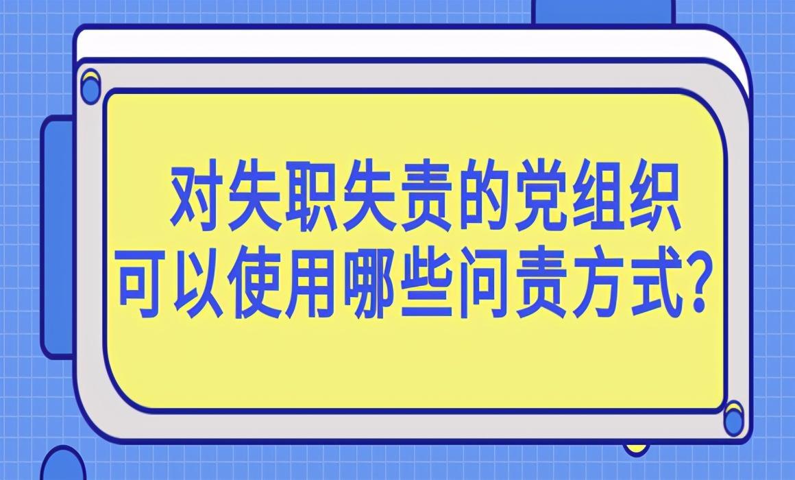 对党组织失职失责行为的问责方式,包括检查、通报、改组三种。“检查”,是指责令被问责的党组织作出书面检查并切实整改。“通报”,是指上级党组织责令被问责的党组织认真改正自身行为,同时将上述问题在一定范围内予以公布,希望其吸取教训、引以为戒,并发挥警示作用。“改组”,是指对失职失责,严重违犯党的纪律、本身又不能纠正的党组织,应当由上级党组织予以改组。党章第四十四条规定:“对于严重违犯党的纪律、本身又不能纠正的党组织,上一级党的委员会在查明核实后,应根据情节严重的程度,作出进行改组或予以解散的决定,并报再上一级党的委员会审查批准,正式宣布执行。”