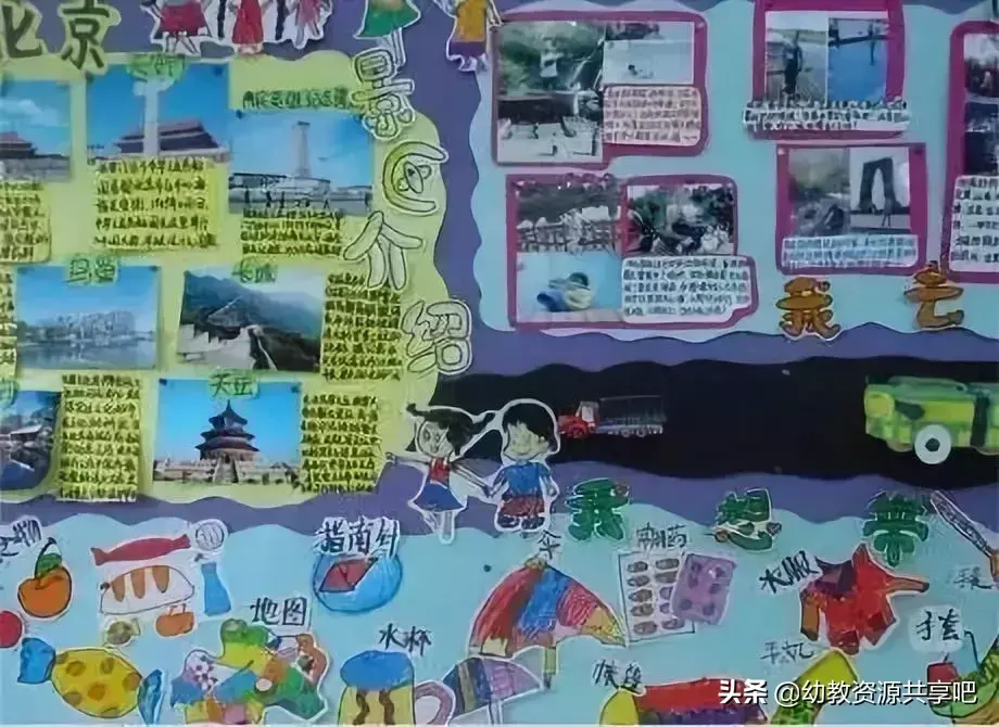 旅行中的物品准备、建筑物、风俗习惯、纪念品、旅游海报、交通工具,全面get幼儿的兴趣点。照片环创,幼儿可以通过一张照片,无限的调动自己的记忆参与话题分享。让你的活动不冷场!