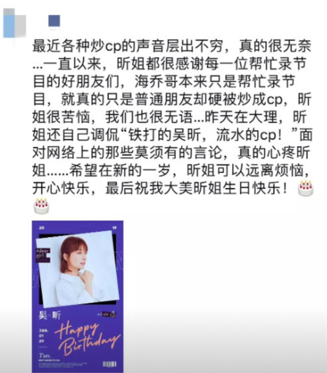最近,吴昕的生日时,徐海乔也是及时的送上了祝福,并且参与了吴昕的生日庆祝会,可是,就在吴昕过完生日之后不久,吴昕方的工作人员就对二人的CP事件做出了回应,称二人仅仅只是非常好的朋友,并没有恋爱,只是大家觉得很甜,希望大家不要乱猜测。