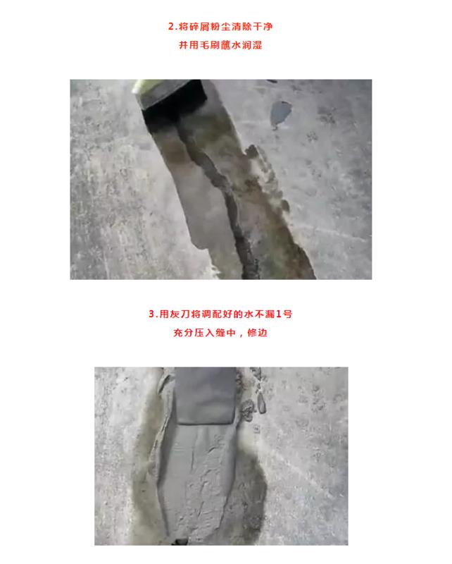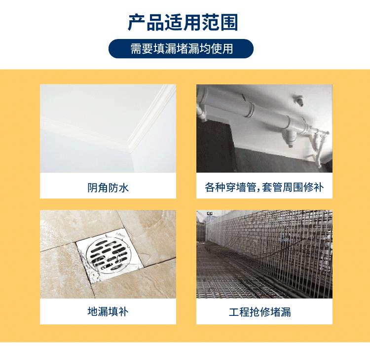 水不漏可用于防水节点部位的加强处理。例如阴阳角、管口、地漏、门槛等,也可用于对墙地面、屋面非结构性大于0.3mm裂缝的修补。由于卓兴水不漏属于快干型产品,3-5分钟终凝,因此在调配时,需要特别注意其加水比例,如果太稠则会干固太快;如果调的太稀则会导致水不漏有效成分没办法正常凝固,从而无法产生应有强度的现象。
