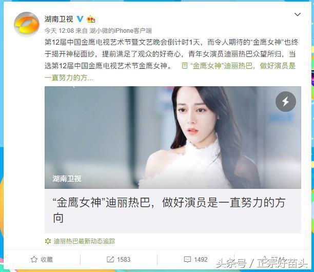 就是今天中午,湖南卫视官微宣布而令人期待的“金鹰女神”也终于揭开神秘面纱,提前满足了观众的好奇心,青年女演员迪丽热巴众望所归,当选第12届中国金鹰电视艺术节金鹰女神。