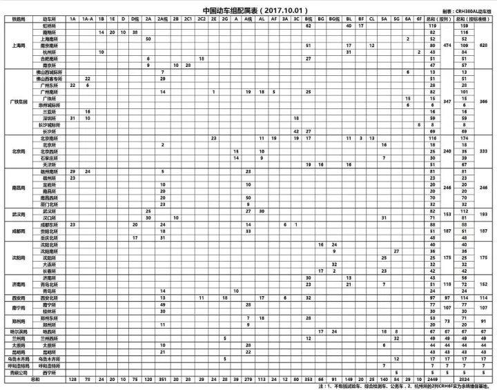 据网友CRH380AL统计,截至2017.10.01,中国中车集团公司共向中国铁路交付2449组(2824标准组)动车组,标准组是指换算成8辆编组的动车组,也就是一列16辆编组的动车组,按照两列8辆编组的标准动车组进行计算。所有这些用于载客运营(不包括试验车、动检车、公务车),分布于18个铁路局(铁路集团)的53个动车所,每天担当超过4000余列车车次任务。