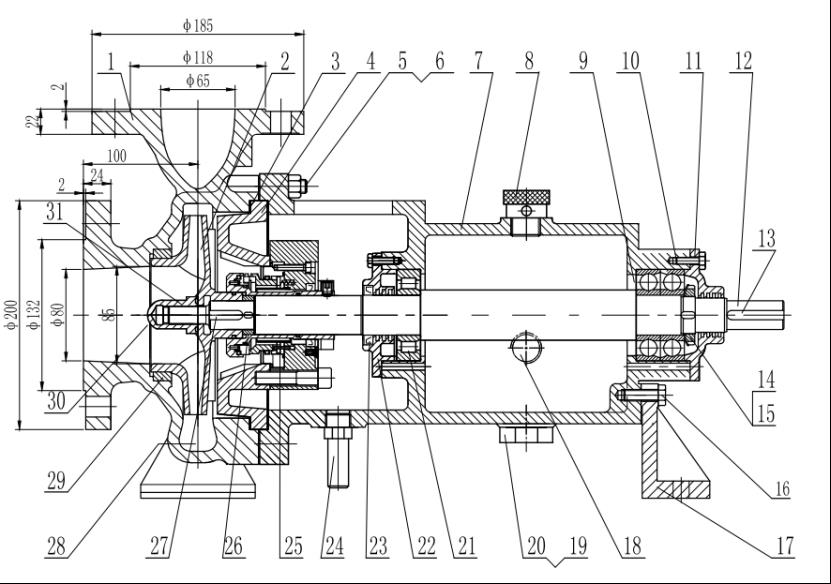 1-泵壳 2-叶轮 3-密封垫片 4-泵盖 5-双头螺柱 6-螺母、垫片 7-轴承箱 8-通气帽 9-轴承 10-螺栓 11-轴承压盖 12-泵轴 13-键 14-圆螺母 15-止动垫圈 16-螺栓 17-支架 18-油视镜 19-丝堵 20-丝堵密封垫片 21-轴承 22-轴承压盖 23-油封 24-排液管 25-机封 26-短轴套 27-键 28- 29-泵体口环 30-叶轮锁母