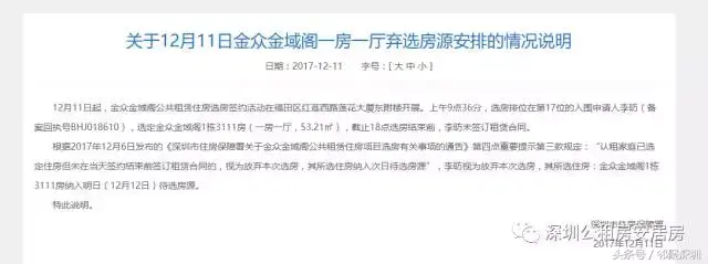 深圳市2017市级公租房〔金众金域阁〕选房结果