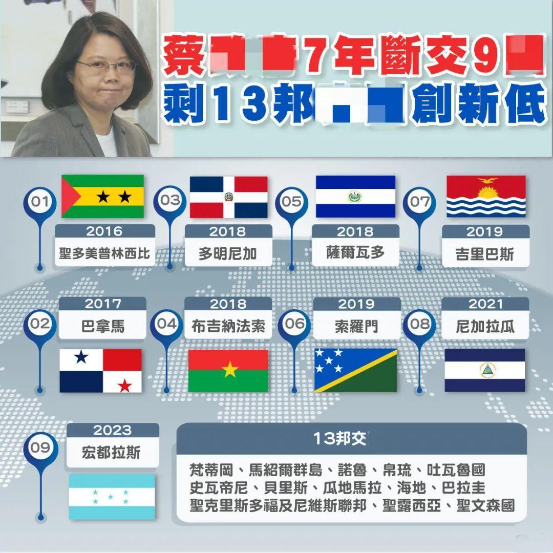 2013年冈比亚宣布与台湾当局断交、与中华人民共和国复交。到马英九卸任时台湾当局的“邦交国”减少到22个。2016年蔡英文上台后的七年间又有9个国家宣布与台湾当局断交:2016年圣多美和普林西比与台湾当局断交;2017年巴拿马与台湾当局断交;2018年多米尼加、萨尔瓦多、布基纳法索与台湾当局断交;2019年基里巴斯、所罗门群岛与台湾当局断交;2021年尼加拉瓜与台湾当局断交。