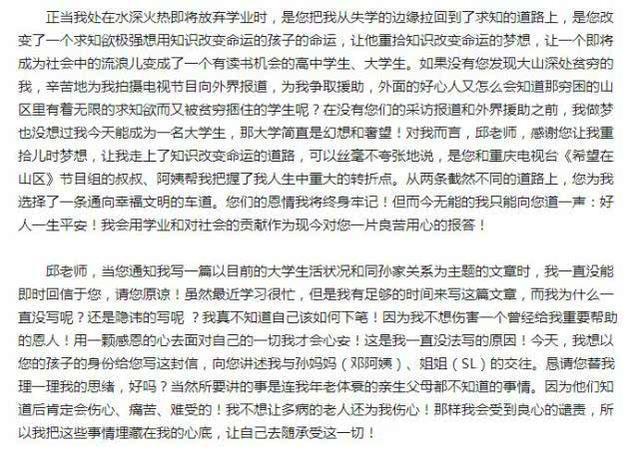 在"感谢信"中向海清表示,自己不知该如何下笔去指责一个曾经帮助过他的恩人,并且还详细地说到了孙俪对她资助的全过程。