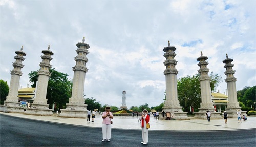 南山景区超级大,能叫得上名字的景点就有:南山寺、海上观音、观音文化苑、天竺圣迹、佛名胜景观苑、十方塔林、归根园、佛教文化交流中心、素斋购物一条街等。估计没有人能一天之内全部游览到位。百分之九十九的游客以海上观音为主要打卡点,其余的都是根据剩余时间来定,顺带着打个卡拍个照证明到此一游便可了。分享一下我和老妈选择的几个拍照打卡点,也是朝拜观音的整个路线。