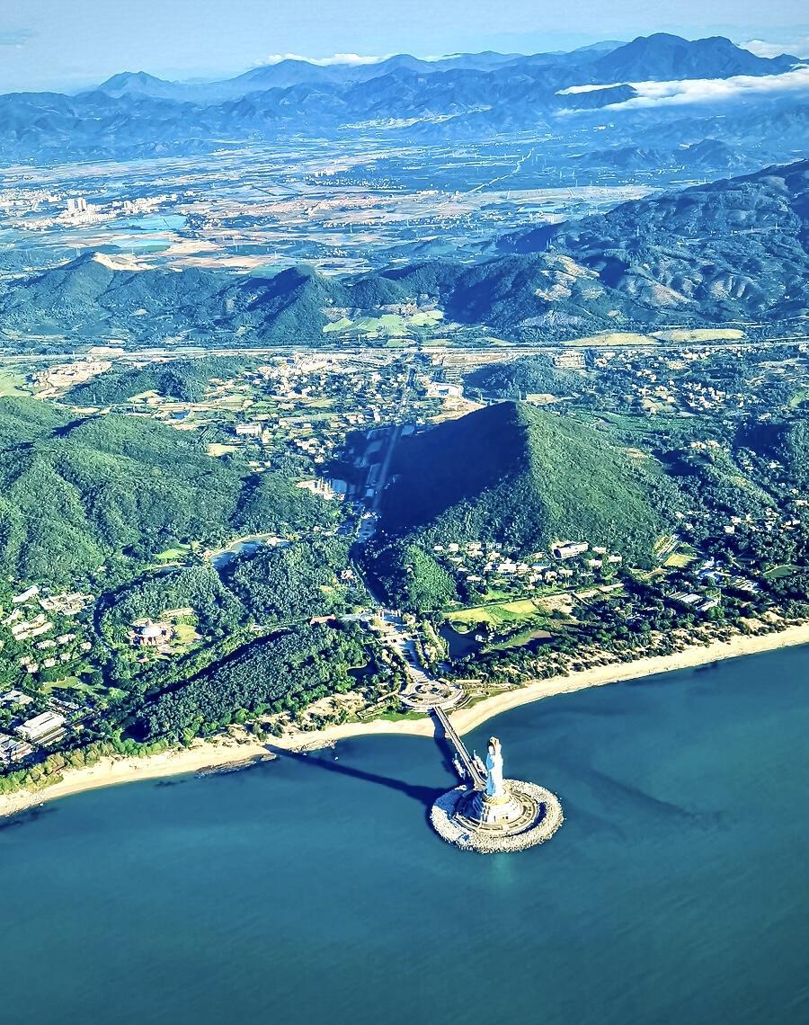 飞机即将落地三亚凤凰机场,从小窗口就可以看到高108米的海上三面观音了,不愧是三亚的海,干净透亮的像蓝宝石一样。多年前我们全家朝拜过一次海上观音,但那次我们没有走到观音脚下“摸佛脚”,给这次再来朝拜预留了一次上好的理由。