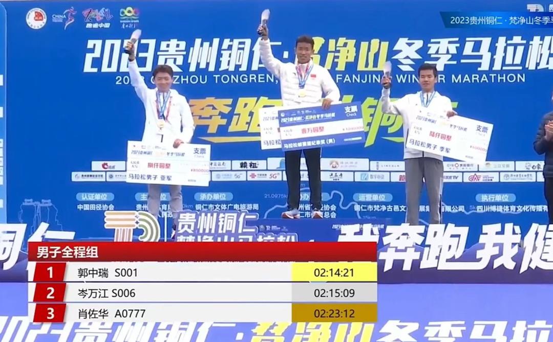 全程马拉松男子冠亚季军分别为郭中瑞2小时14分21秒、岑万江2小时15分09秒、肖佐华2小时23分12秒。