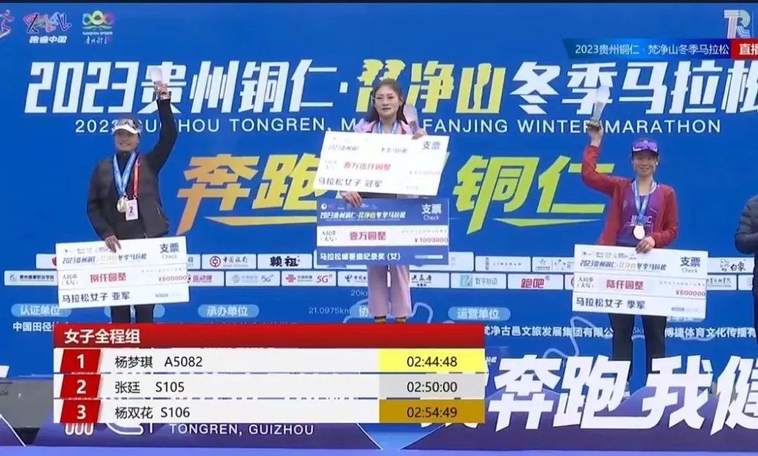 全程马拉松女子冠亚季军分别为杨梦琪2小时44分48秒、张廷2小时50分00秒、杨双花2小时54分49秒。