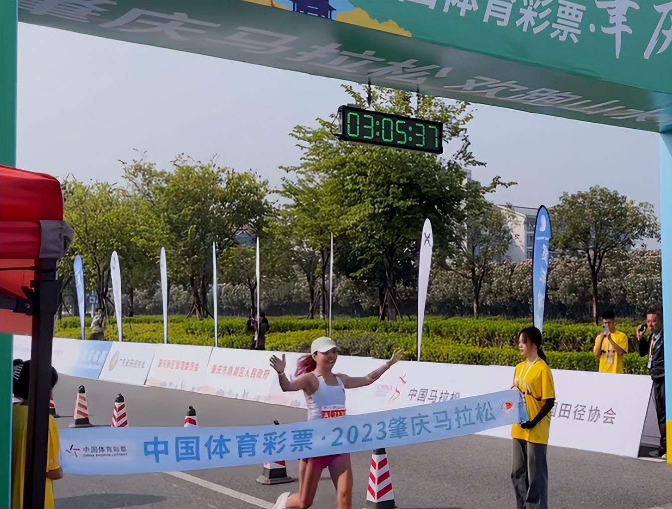“全马”女子组冠军是赵丽文,她的枪声成绩是3:05:37,净成绩是3:05:17。