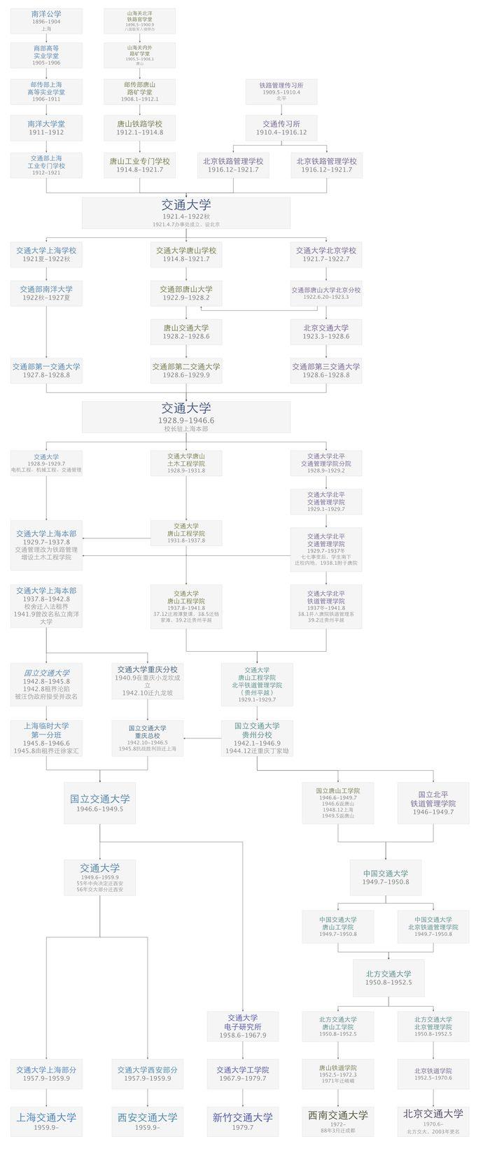 国内著名的交通大学,有出自南洋公学一脉的西安交通大学、上海交通大学、阳明交通大学,也有源自1909年铁路管理传习所的北京交通大学和源自1896年山海关北洋铁路官学堂的西南交通大学。