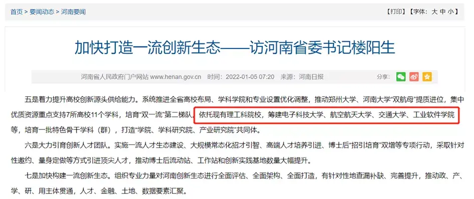 1月5日,好消息传来,河南省领导公开表示,将依托现有理工科院校,筹建电子科技大学、航空航天大学、交通大学、工业软件学院等等。