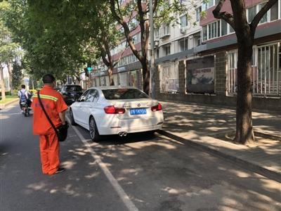 6月20日,北京市朝阳区呼家楼街道附近,身着橙色制服的工作人员正在有条不紊地指挥着一辆私家车停入划线区域。