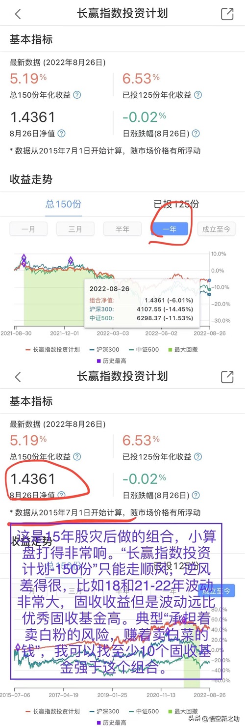 普通人要选组合,还不如选“正规军”,比如交银施罗德的【我要稳稳的幸福】,该组合成立5.5年,比“长赢指数投资计划-150份”少1.5年,但是收益达41%,并且非常稳定,历史收益曲线非常漂亮,而“长赢指数投资计划-150份”则难看极了,18年和21-22年奇差无比。最近一年【我要稳稳的幸福】收益是1.99%,远好于“长赢指数投资计划-150份”