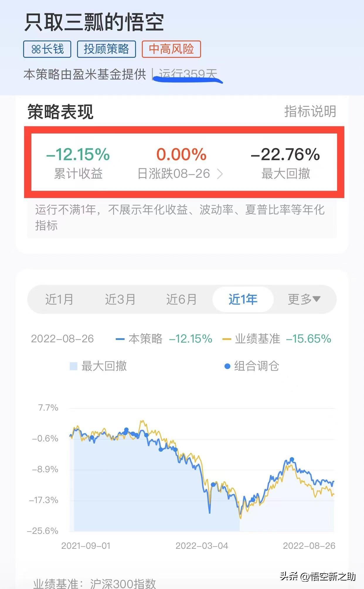 随便举个刚成立一年的策略【只取三瓢的悟空】(最近一年收益-12.15%)就大幅领先“长赢指数投资计划-S定投”(最近1年收益-19.81%),