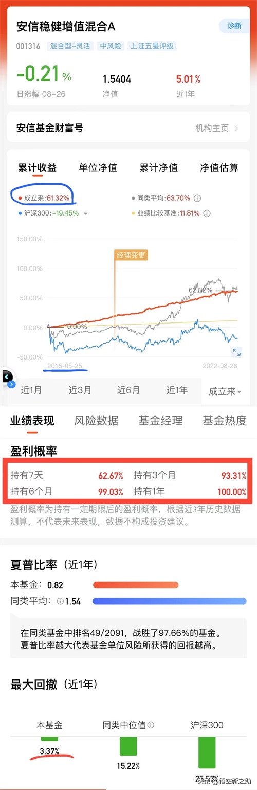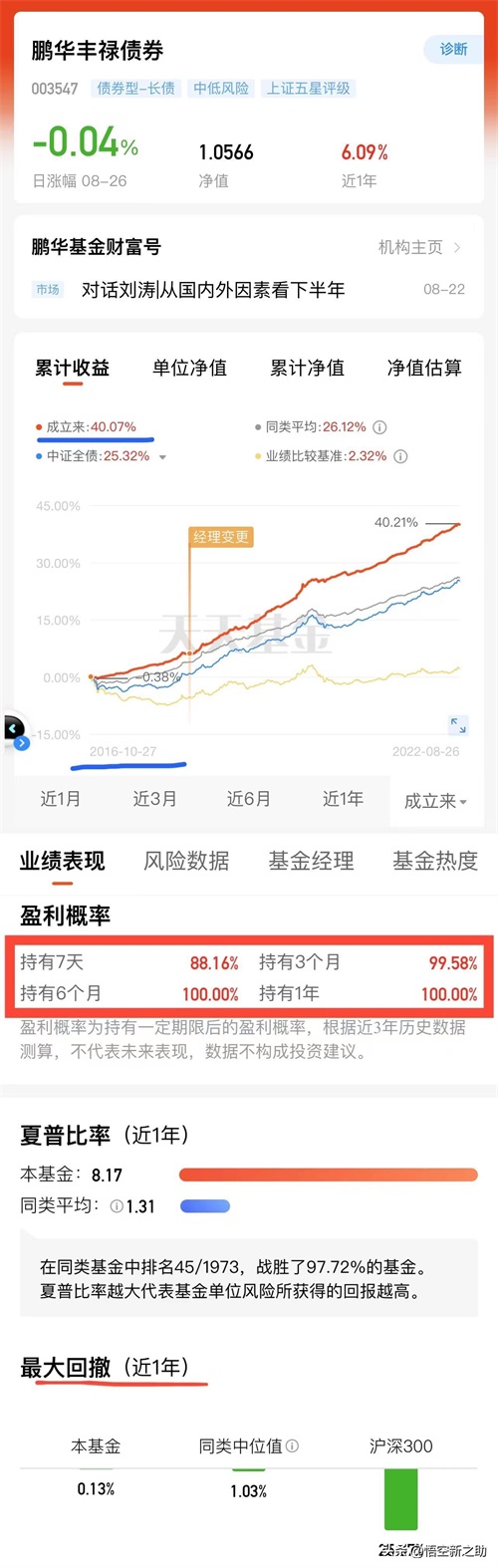 “长赢指数投资计划-150份”成立7年,累计收益43.61%,远逊很多公募固收基金,比如我下面随便列举的两个固收基金。而且该组合是15年股灾后成立的,小算盘打得很好,因为股灾消化了很多风险,他们不怕大幅下跌,属于简单模式,这也是为什么我告诉大家判断一个基金经理水平主要看其股灾、熊市等逆境下的能力,而不是顺境如何,下图可见,其18年大熊市和21-22年大动荡业绩都非常不好