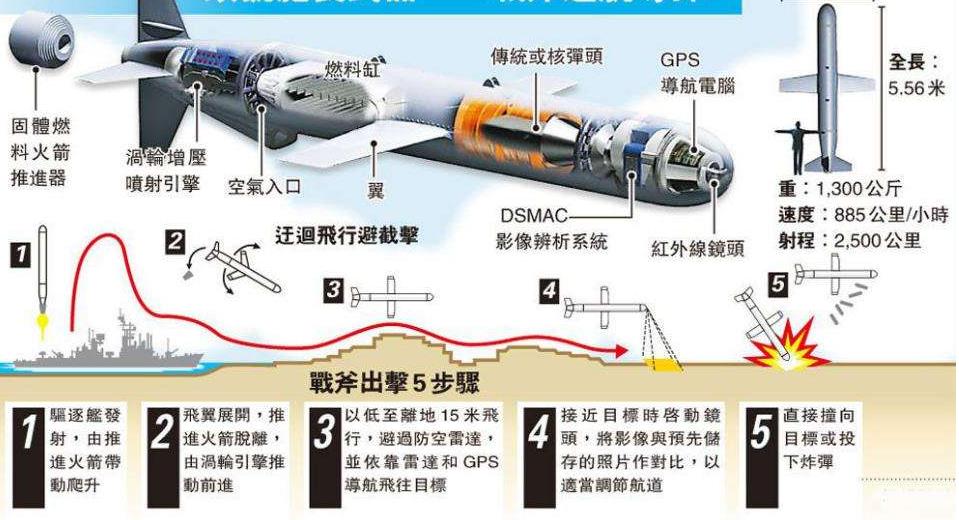 战斧巡航导弹,弹重1300公斤,全长6.25米,宽度直径0.52米,填装的高爆炸药重量为450公斤,最大射程为2500公里,巡航速度达885公里/小时,造价每支约186万美元,战斧巡航导弹是一种长程,全天候,具有短翼,以次音速巡航飞行的导弹。主要的特点是射程远,飞行高度较低,具有一定的隐身能力,突防能力较强,且损伤效果好,通用性强,可由各种平台发射。并且体积小,重量轻,弹翼和尾翼可折叠,便于运输和发射。并且使用弹性强,机动灵活,生存能力高.