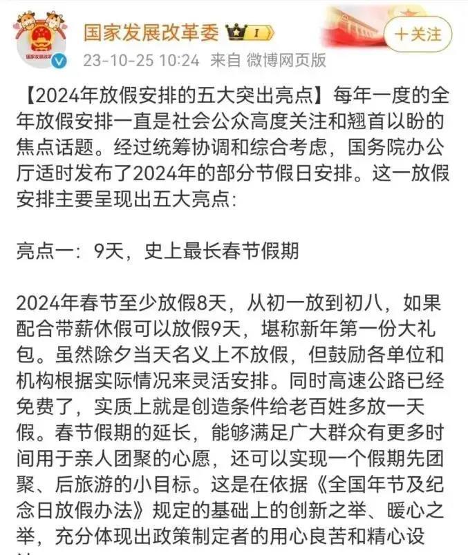 2024年的春节假期,伴随着高速连续免费9天的好消息,放假安排也引起了广泛关注。尽管除夕当天不放假,但是官方表示各单位和机构可以灵活安排,让大家多放一天假,实质上并不会影响到除夕的团圆。不过,这个决定却引起了网友们的讨论和不满。为什么除夕不放假?这样的假期安排真的合理吗?政府的回应是,这一放假安排主要呈现出五大亮点。亮点一是史上最长春节假期,从初一放到初八,至少放假8天,如果再配合带薪休假可以放假9天。虽然除夕当天名义上不放假,但是政府鼓励各单位和机构灵活安排,给大家多放一天假。这样的假期延长能够满足广大群众有更多时间用于亲人团聚,同时也给了大家先团聚、后旅游的自由选择。这是政府在全国年节及纪念日放假办法的基础上做出的创新之举,展现了政策制定者的用心良苦和精心设计。亮点二是放假安排调休更加人性化和灵活性。调休是放假安排中社会公众普遍关心的话题。