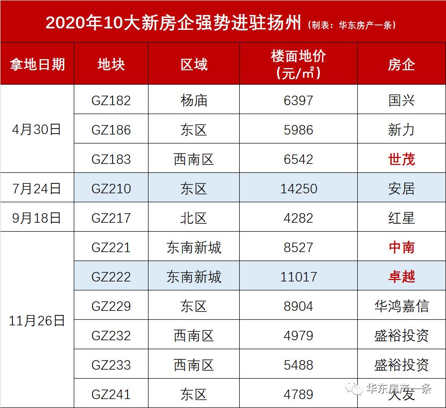 新进驻扬州的房企包括世茂、中南、卓越等知名房企,值得注意的是,安居、卓越首进扬州,就直接上手万元地块,中南首进也拿下了8000元/㎡+的高价地,可见房企对扬州楼市发展前景的信心!