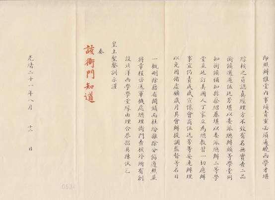1895年9月30日,直隶总督兼北洋大臣王文韶奏请光绪皇帝创办西学学堂的奏折(复制件)中的部分内容。10月2日,光绪皇帝在该奏折上御笔朱批“该衙门知道”,并于当日将其以军事急件的形式“四百里马递发回”