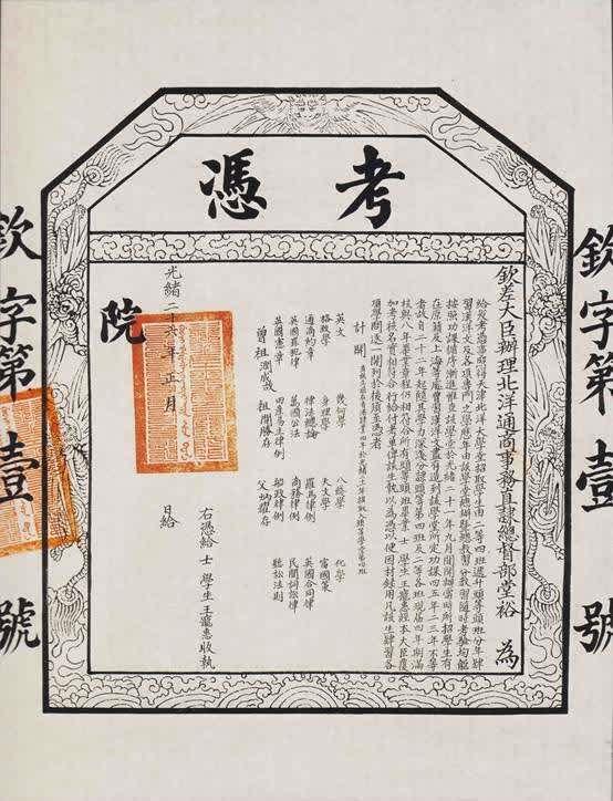 1900年初,直隶总督兼北洋大臣裕禄为北洋大学堂首位毕业生王宠惠颁发的“钦字第一号”“考凭”,是为有史以来由中国政府颁发的第一张大学本科毕业文凭