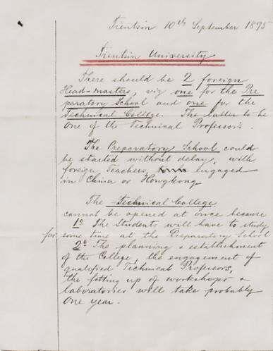 1895年9月10日,丁家立拟订的“天津大学”(Tientsin University)规划书手稿(第1页)