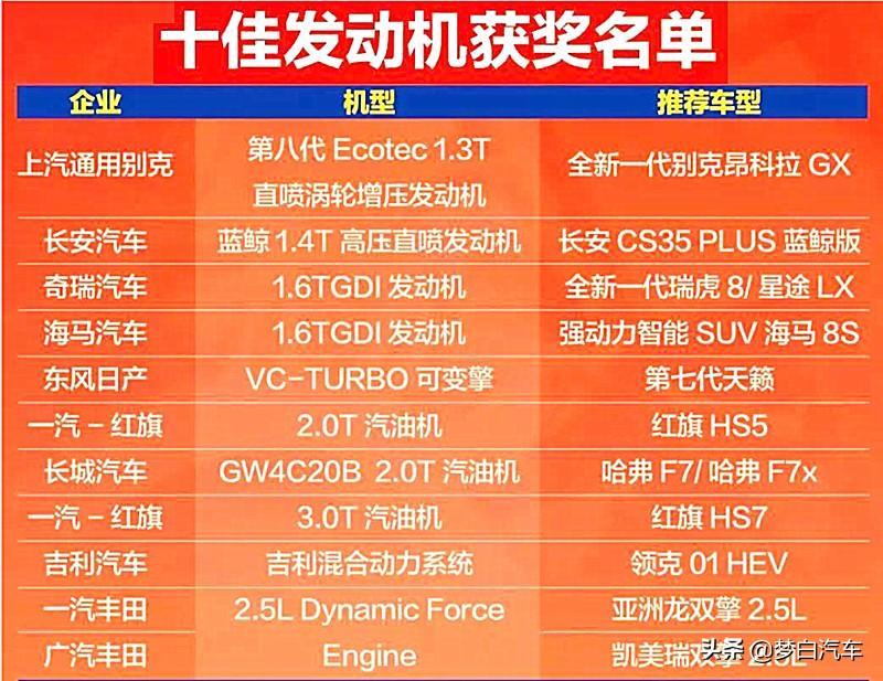 最后除了以上7款发动机上榜之外,另外三款分别是上汽通用的第八代1.3T直喷发动机、东风日产的2.0LVC-TURBO可变压缩比发动机和一汽丰田/广汽丰田的2.5L Dynamic Force Engine(混动)。对于国产发动机的表现,大家怎么评价呢?