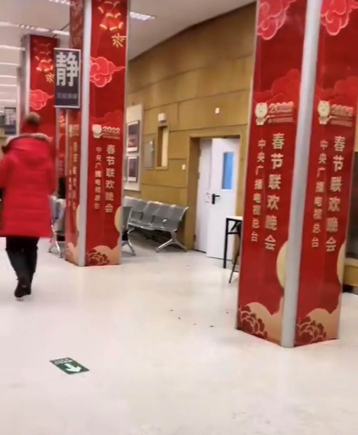从画面中能够看出,央视春晚的后台装饰得十分喜庆。大厅里每一根柱子都贴满了大红色的广告纸,上面既有金色的“2022年春节联欢晚会”字样,还有萌萌的“瑞虎”吉祥物,以及彩云和鞭炮的图案,看起来年味十足。