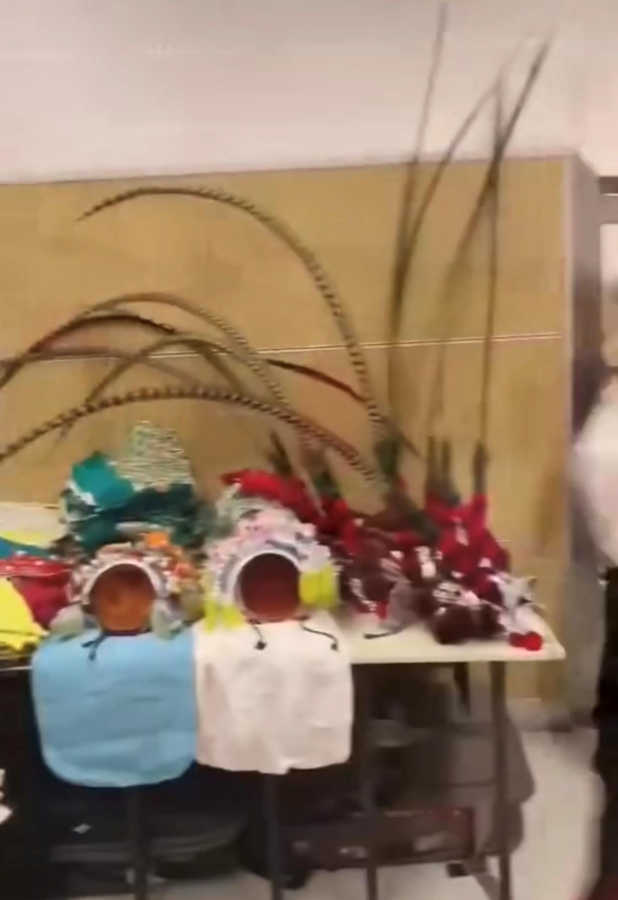 不少演出时使用的头饰整齐地堆放在大厅走廊的桌子上,颜色款式各不相同,看来准备得非常充足。