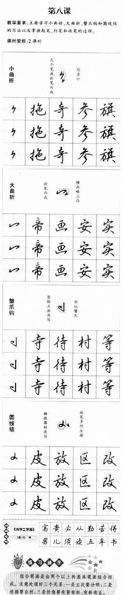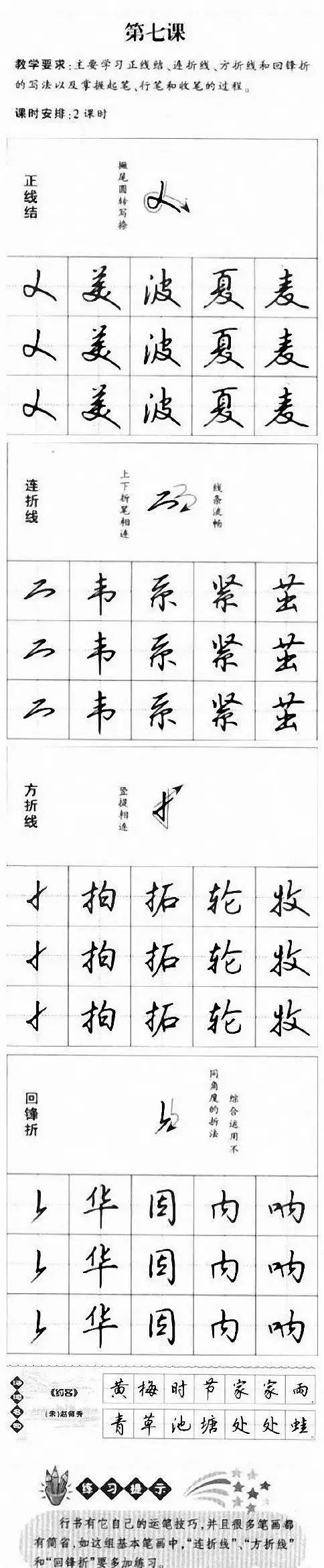 第七课,学习:正线折、连折线、方折线、回锋折(如楷书笔画中的竖折撇),这些主要是转折过程中采用的折线,这些笔画起到中转承接的作用。