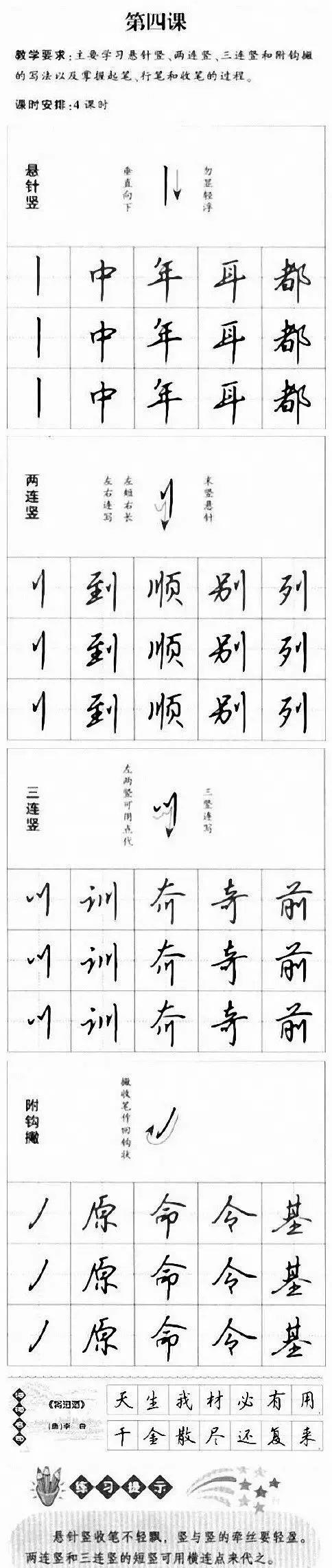 连笔时,部分竖画写法常常带钩,如往左如竖提(即右钩竖),例字:来、朱;往右如竖钩(附竖钩),例字:单人旁、左耳刀旁相关字。竖画还包括:悬针竖、两连竖、三连竖,连竖与连横相同要速写,连竖开头可写成点。