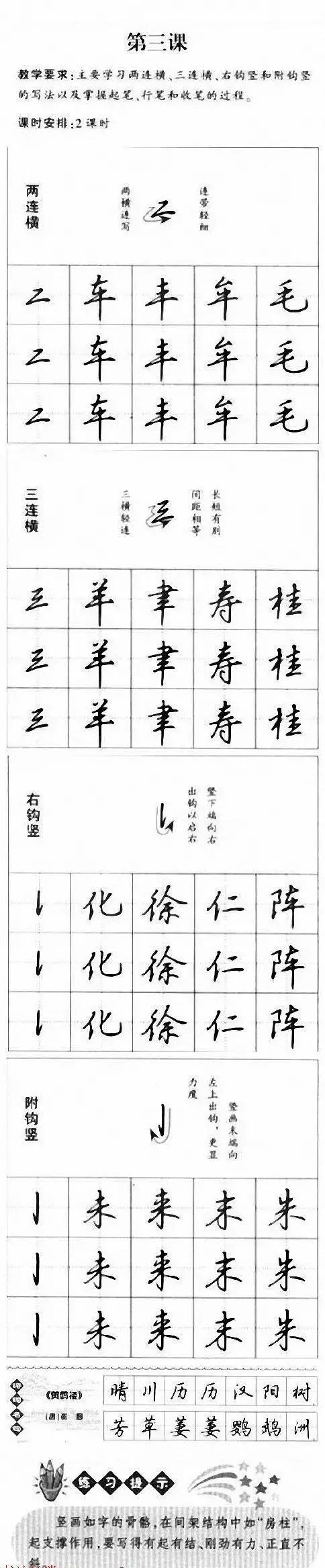 横画主要有上挑横、回笔横、两连横、三连横、,横画如“房梁”,书写时要平直刚健、有起有结,连横的时候要轻细、速连。