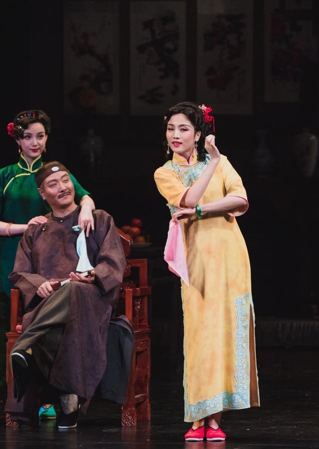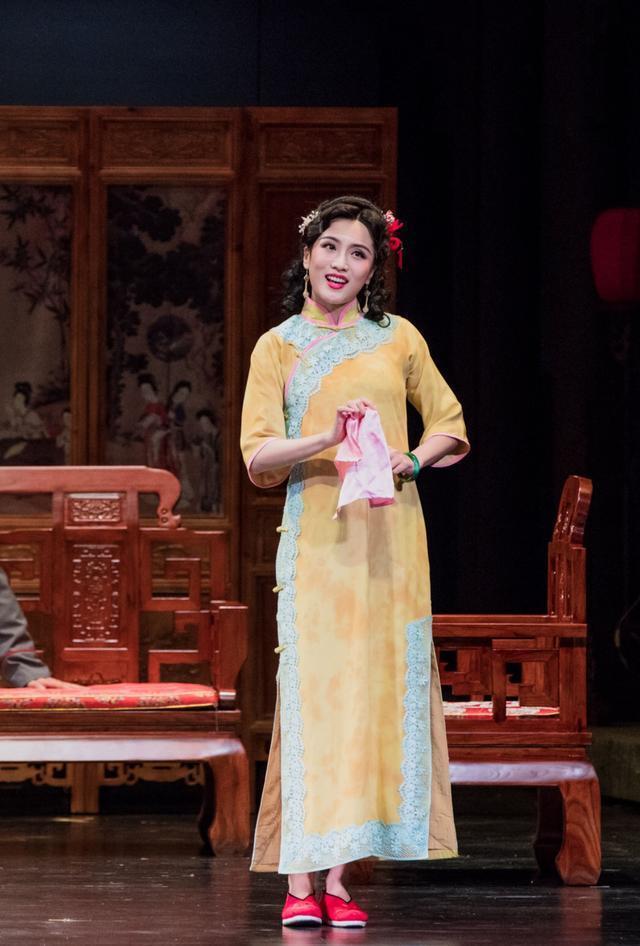 王君瑞身着的这袭旗袍是古典的全开襟旗袍,民初时期的旗袍也没有那么刻意追求曲线美,年代感很强。而王君瑞身着的这袭旗袍廓形还比较硬朗,上身显得有些空荡荡,虽说是比较甜美鲜亮的颜色,但也依旧显老气。或许是为了舞台效果,对于少女来说,的确有些难以驾驭。