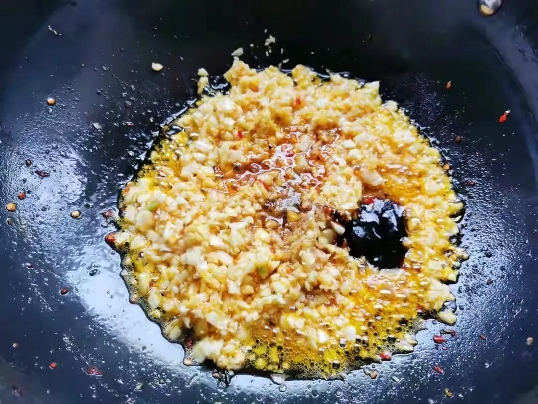 3、处理大蒜时,先将大蒜放在盆中,加入一点点清水,将蒜蓉打湿,这样等会蒜蓉炒制的过程中才不容易发糊发苦。然后将打湿的蒜蓉分成两等份,先将第一份,锅中加入少许油,把蒜蓉炸至外表微黄后倒出,第二份留着备用,接下来咱们开始烹饪调味。