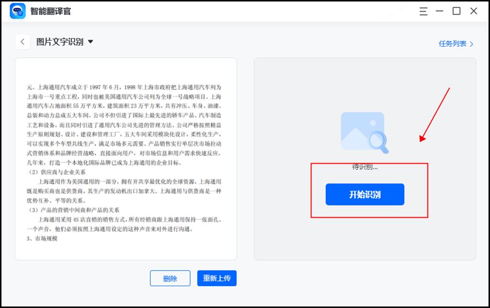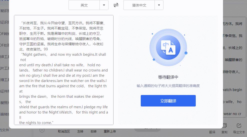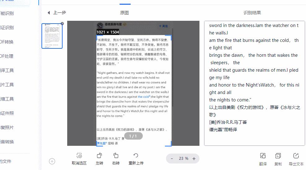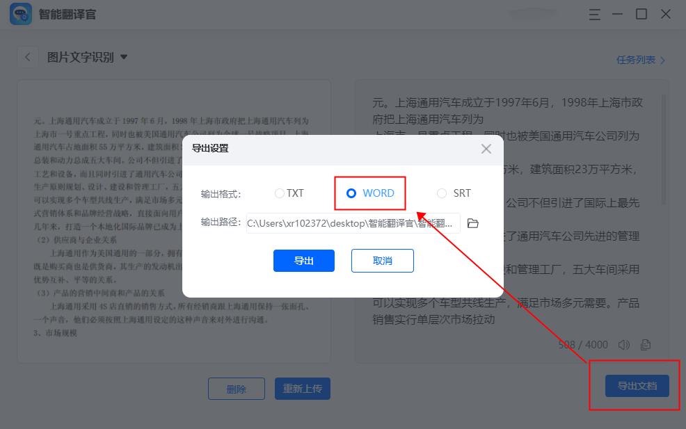 支持一键复制、翻译、导出文档,如需翻译,确定好前后识别翻译的语言,确保翻译更加精准: