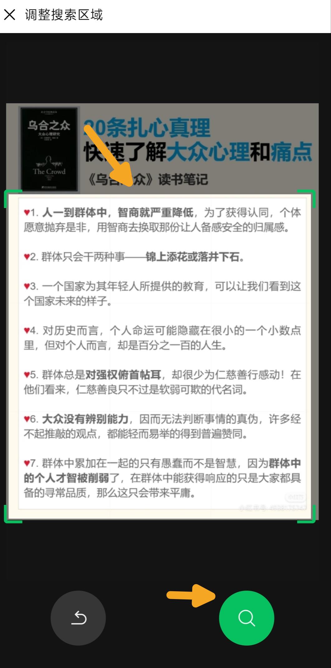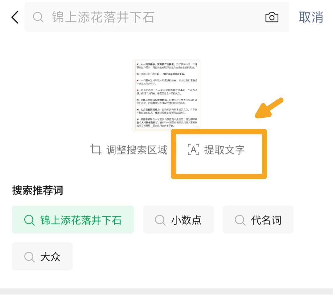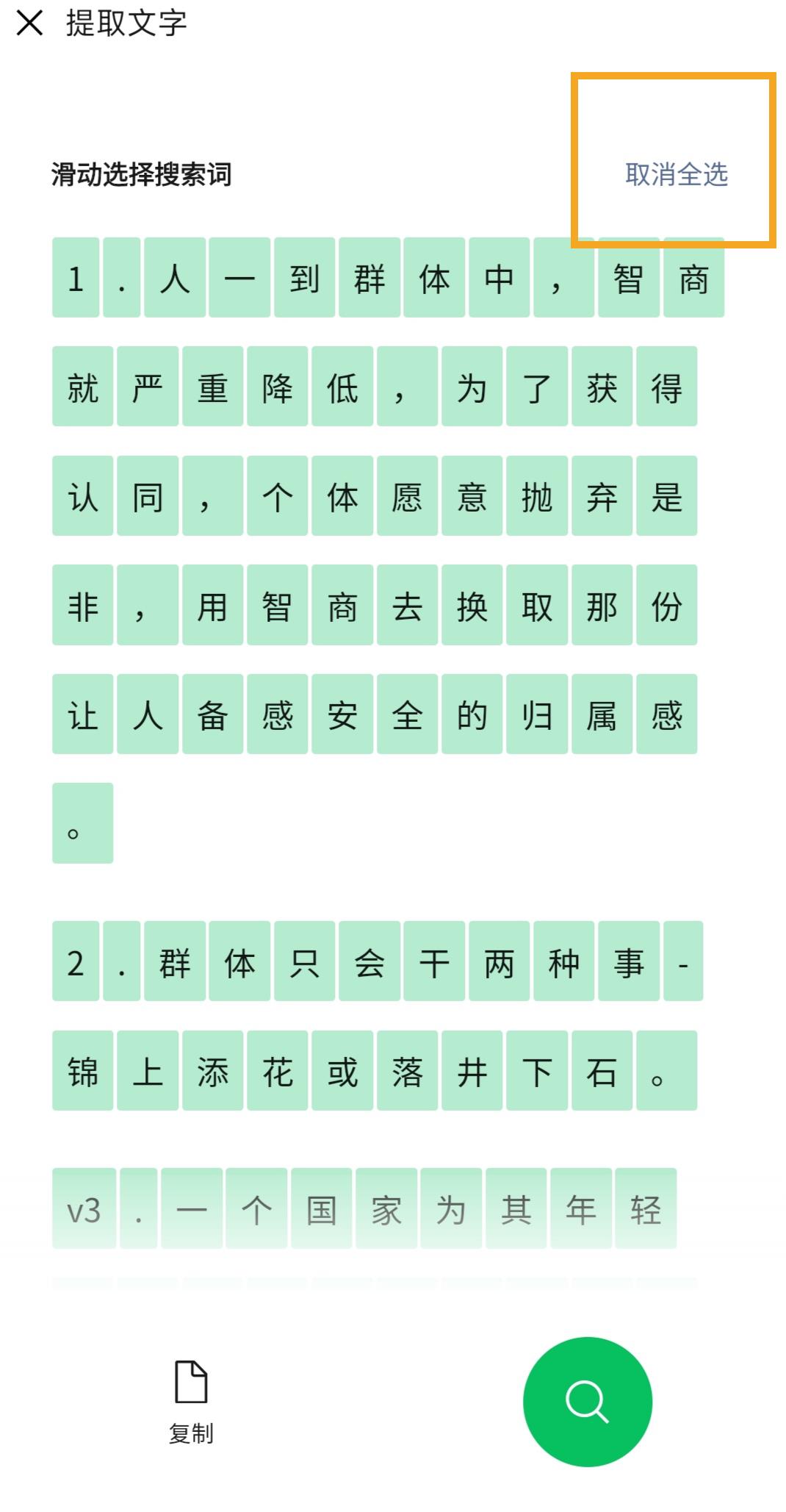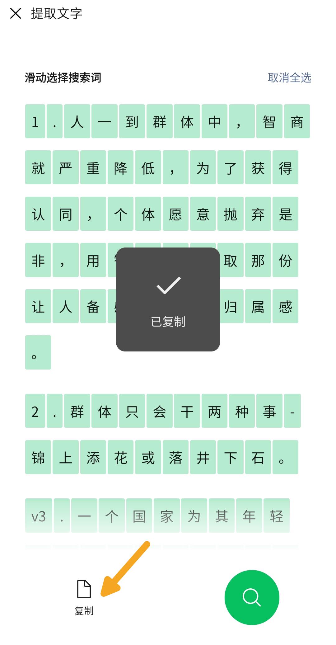 如果需要搜索,则滑动选择搜索词继续搜索;如需要复制文字,滑动查看文字识别是否有误,全选即可完成复制:
