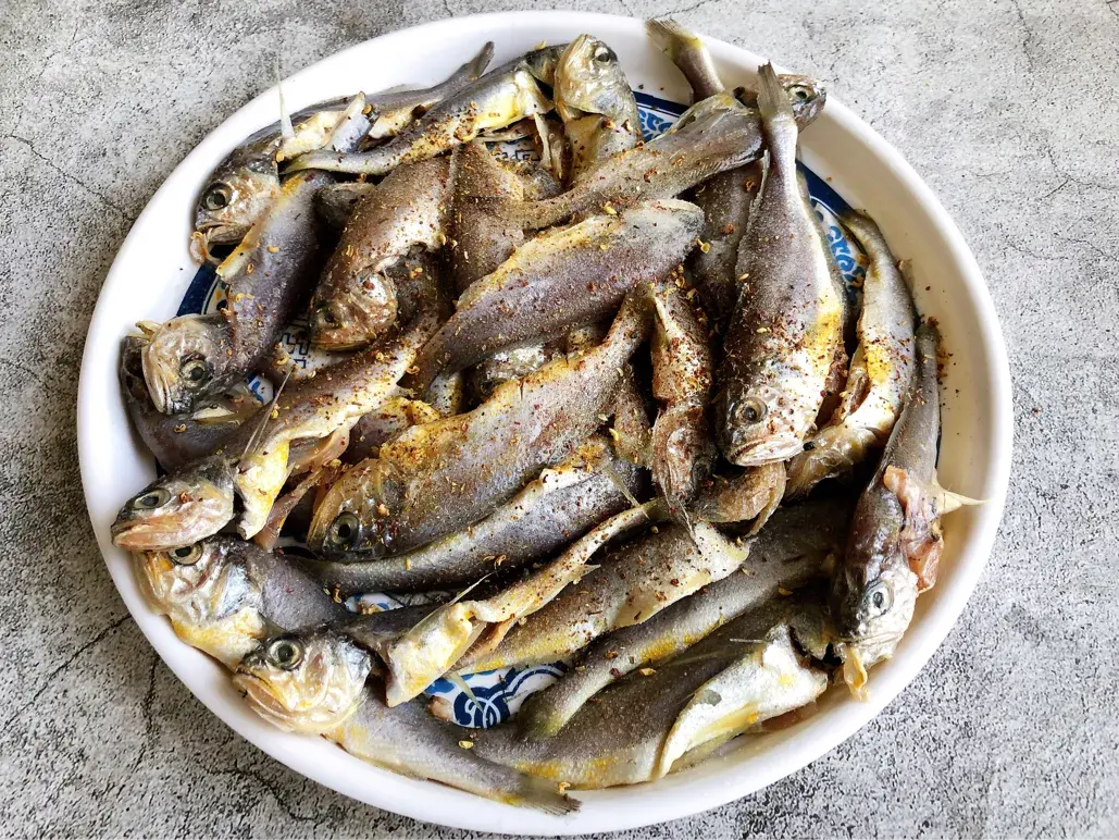 第一步:在我们这边,只能买冰冻黄花鱼,买来的黄花鱼解冻之后去掉内脏,洗干净沥掉水分,从小时候老妈就这样腌鱼:加食盐加花椒碎,抓匀几下就可以了,到到黄花鱼这么小,腌制10分钟就能炸