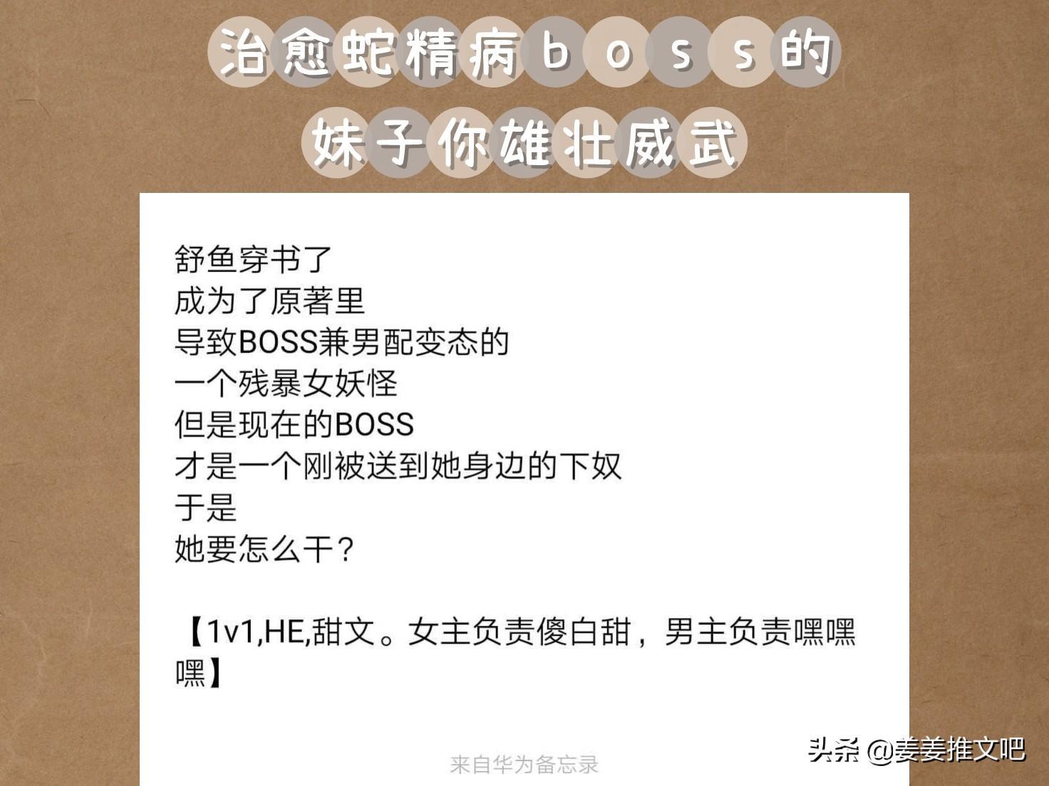 姜姜写的《治愈蛇精病boss的妹子你雄壮威武》的详细推文,感兴趣的小伙伴可以看看