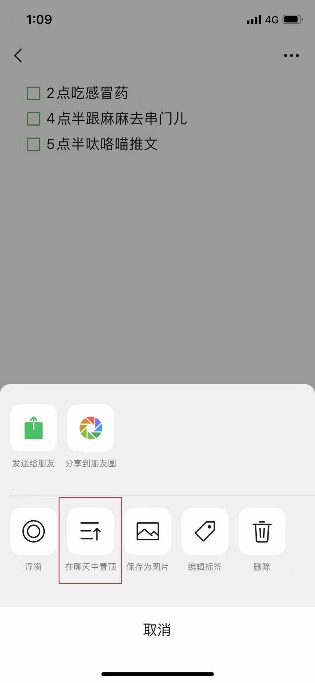 编辑好以后点击右上角“...”,选择“在聊天中置顶”即可。