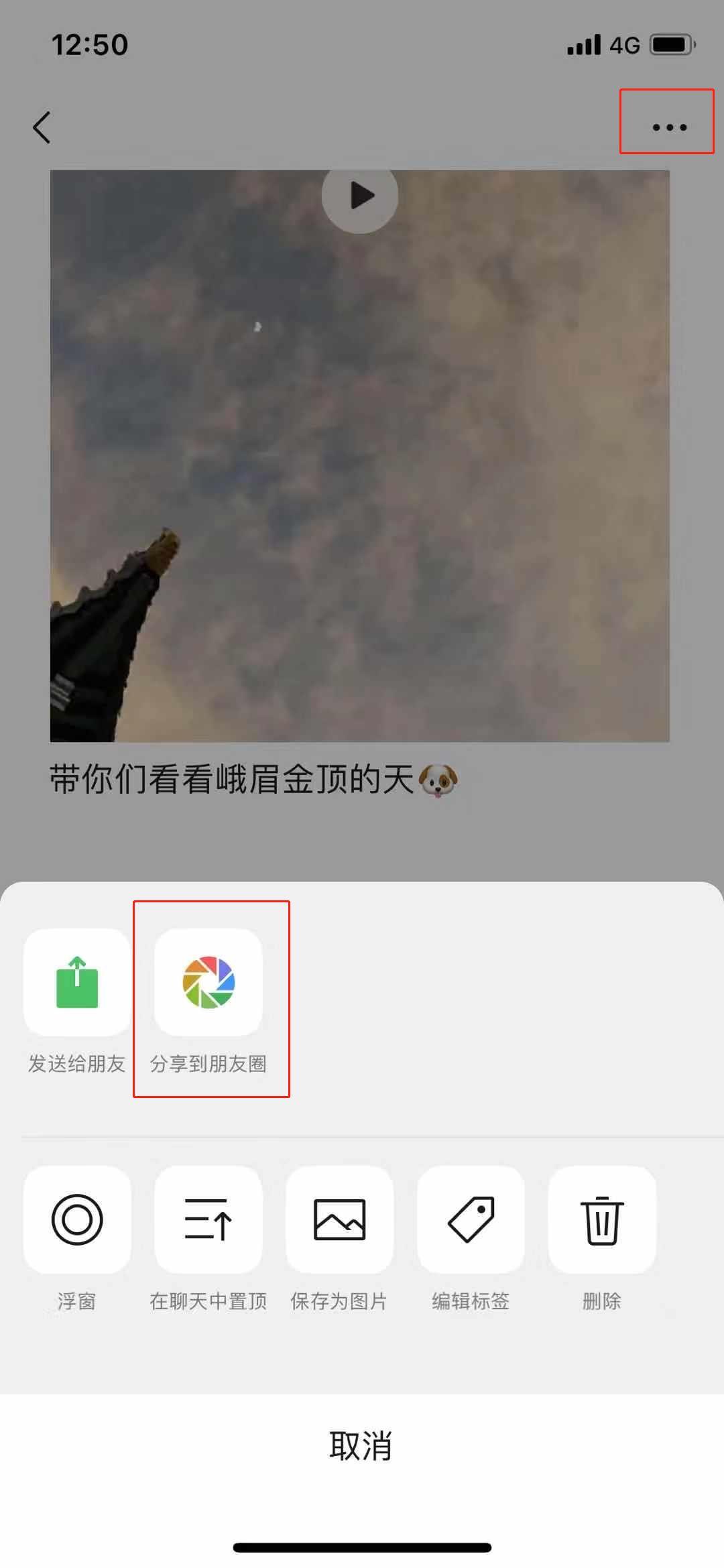 随后点击右上角“...”,然后点击“分享到朋友圈”即可。(我这里特地设置的仅自己可见,你们根据随意就好。)