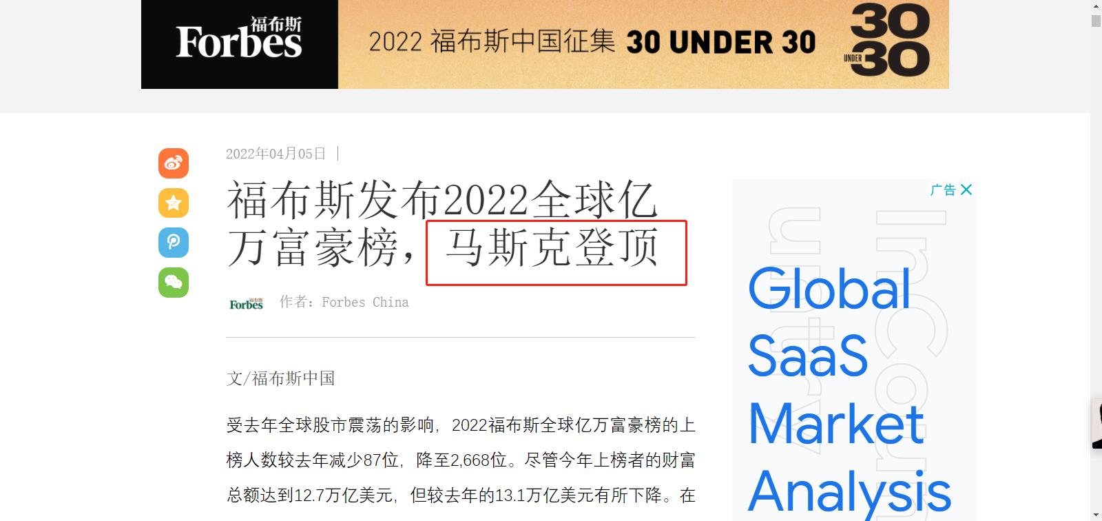马斯克以2190亿美元的财富成为2022年全球首富。