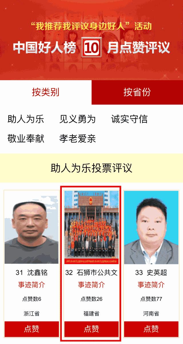 进入“中国好人榜10月点赞评议”专栏,选择“按类别”,点击“助人为乐”,在“32号 石狮市公共文明引导志愿者协会”照片下方点击“点赞”,在页面底部再次点击“点赞”,输入验证码后即可投票。