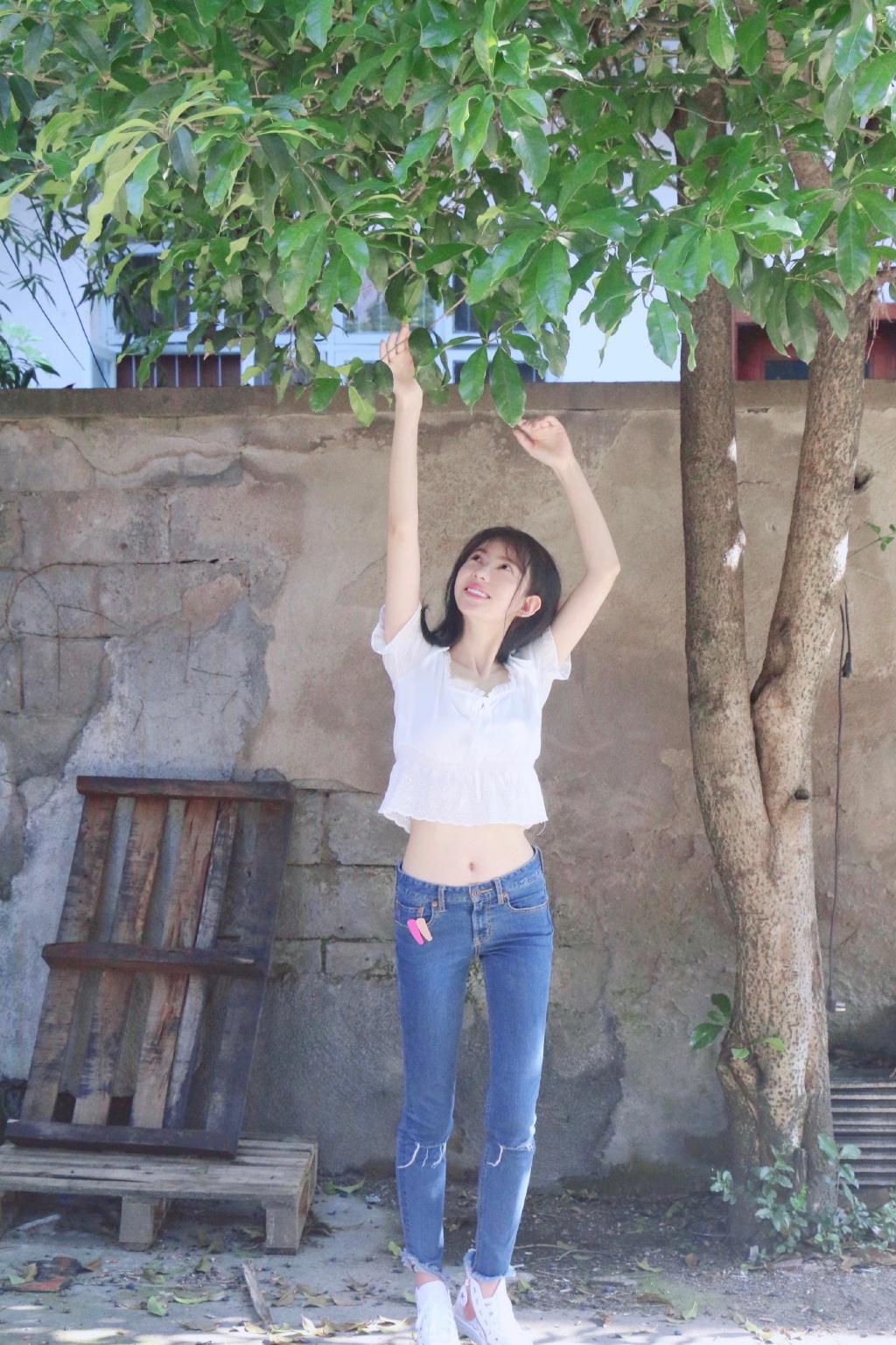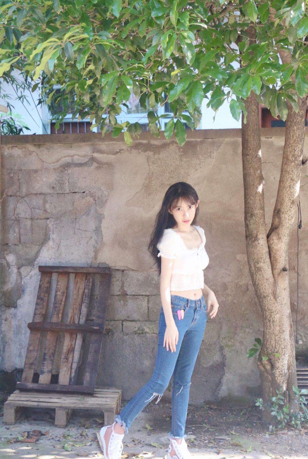 刘萌萌上身穿了件白色短袖,清新的色调很是吻合时下的季节,带有木耳边装饰的衣领,增添了几分甜美可爱风情。下摆处拼接的荷叶边,又摇曳出些许少女气息。更为吸睛的是刘萌萌的纤瘦小蛮腰,白净的肌肤也是充满了小性感。