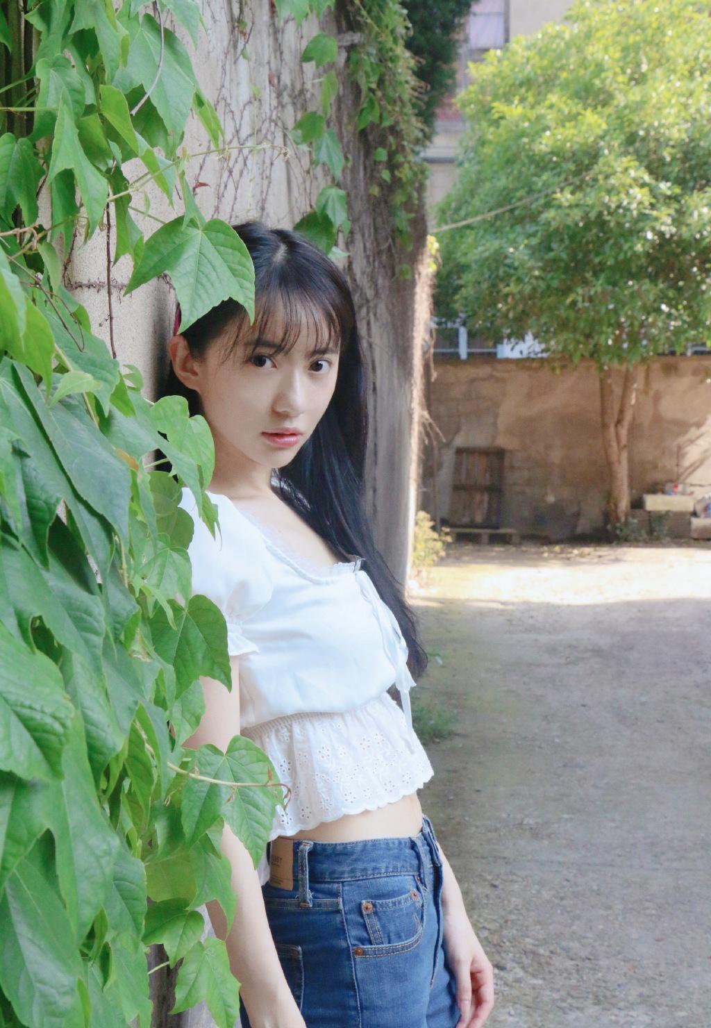 藏在爬山虎后面的刘萌萌目光清澈,流露出十足的少女心,长长的秀发垂搭在身边,洋溢着美少女的青春活力。