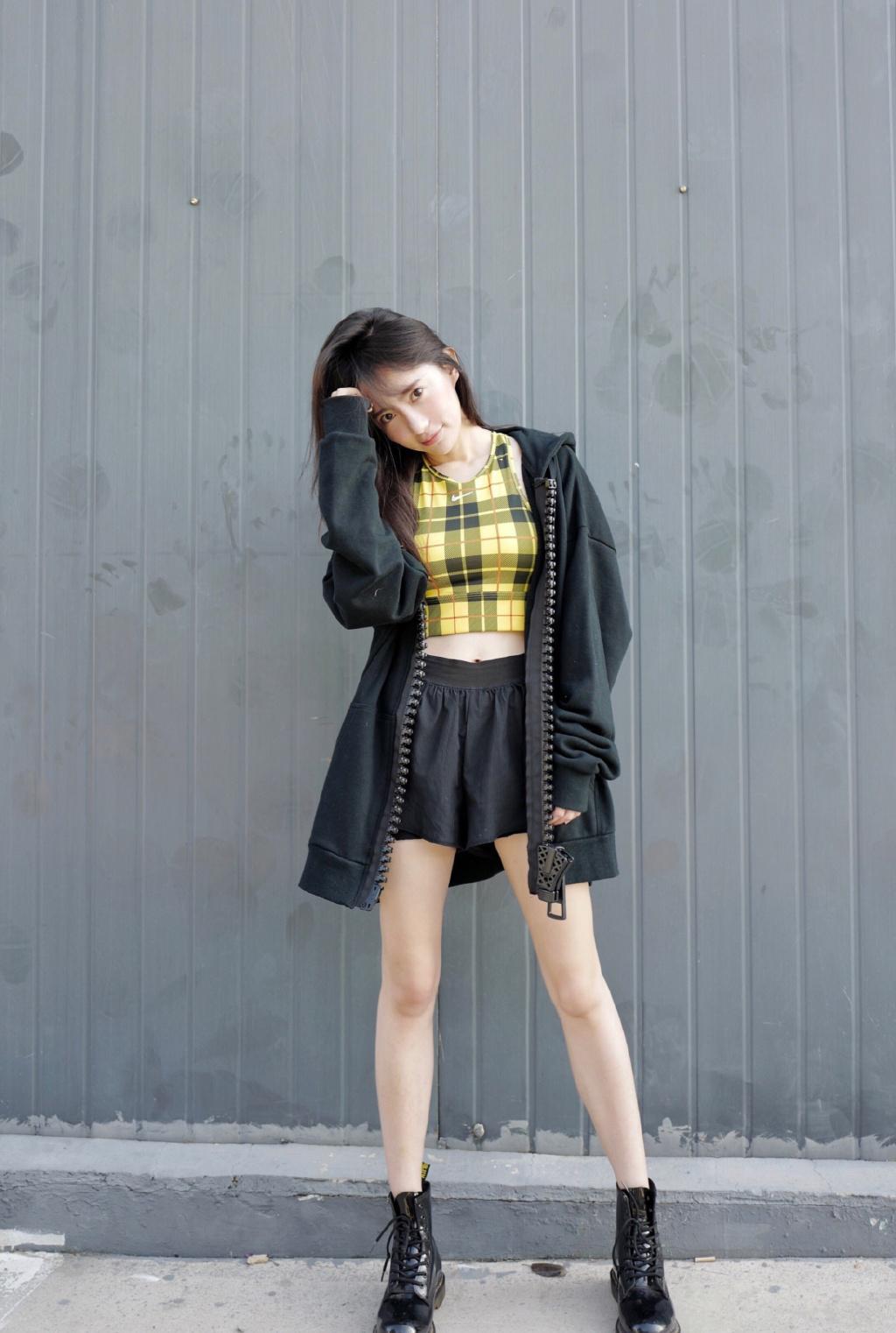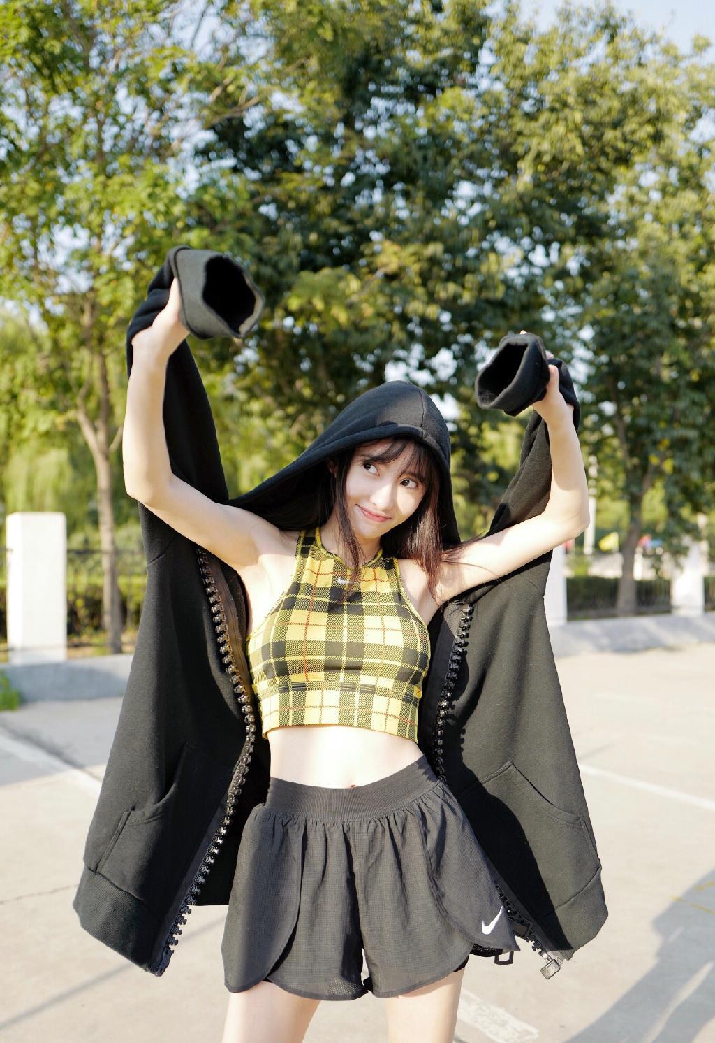 刘萌萌身材好,穿什么样的衣服都好看。内搭格纹紧身背心,色彩艳丽,带来丝丝复古风,同时将其优美的曲线展示出来,小蛮腰也是藏不住啊!颇为吸睛,下身搭配的是黑色短裤,外面套了件oversize廓形的外套,打造出下衣失踪的风格,秀出其长长美腿,直直的线条,简直如竹竿腿一般了。